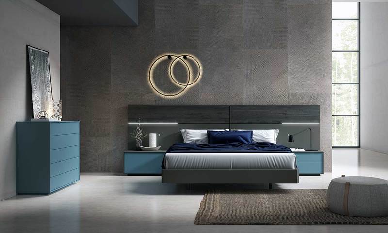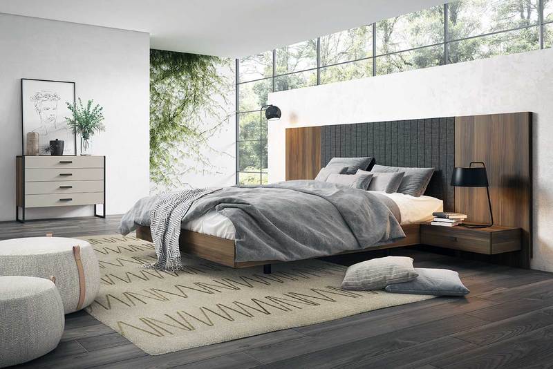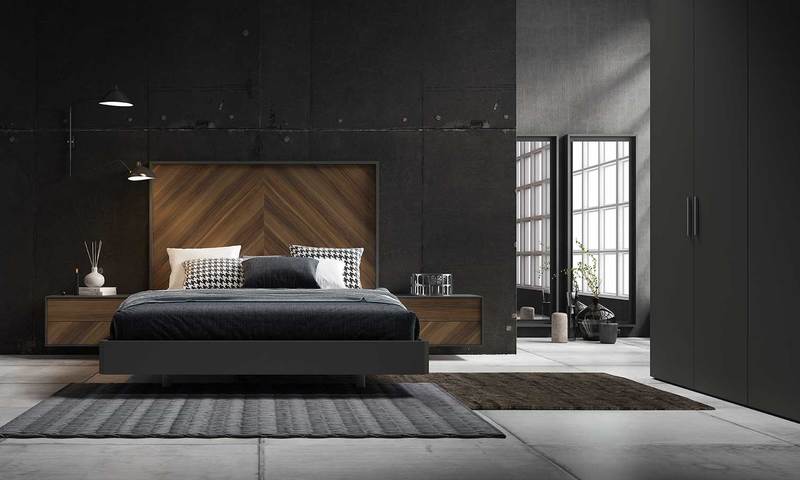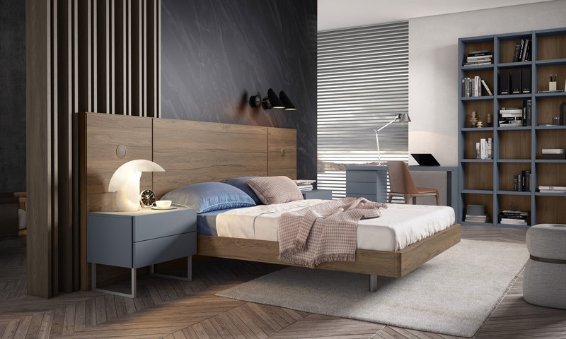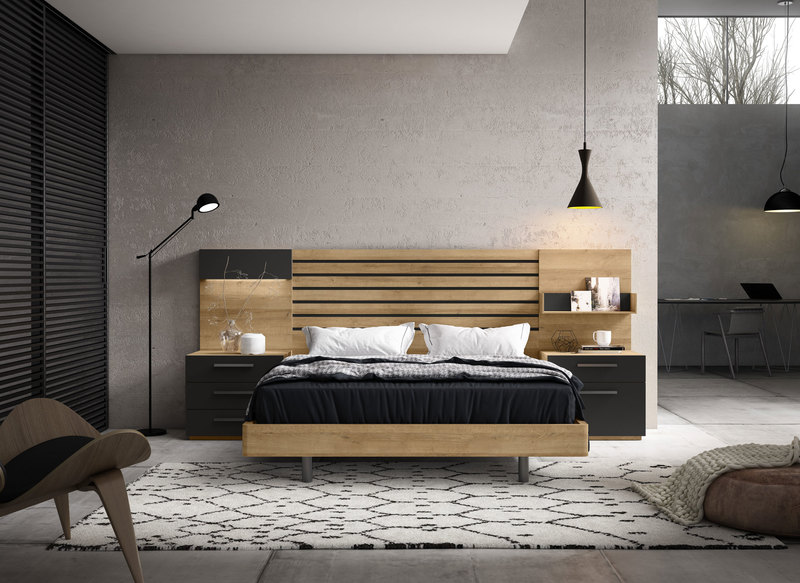 • Cabecero nogal y antracita a juego con mesitas