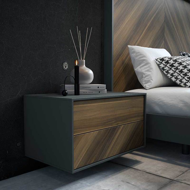 • Detalle color nogal en mesita y cabecero
